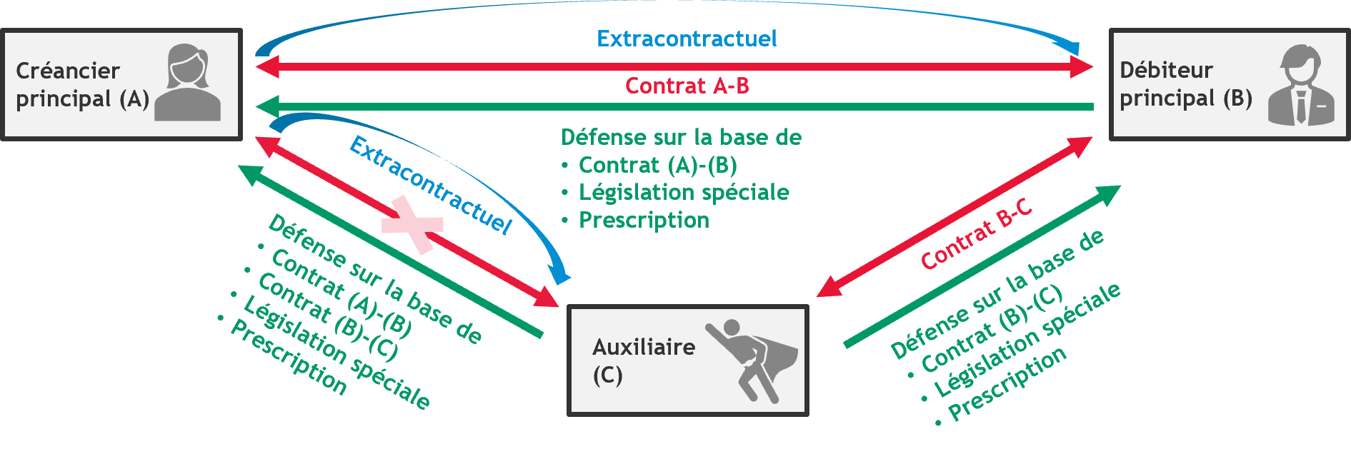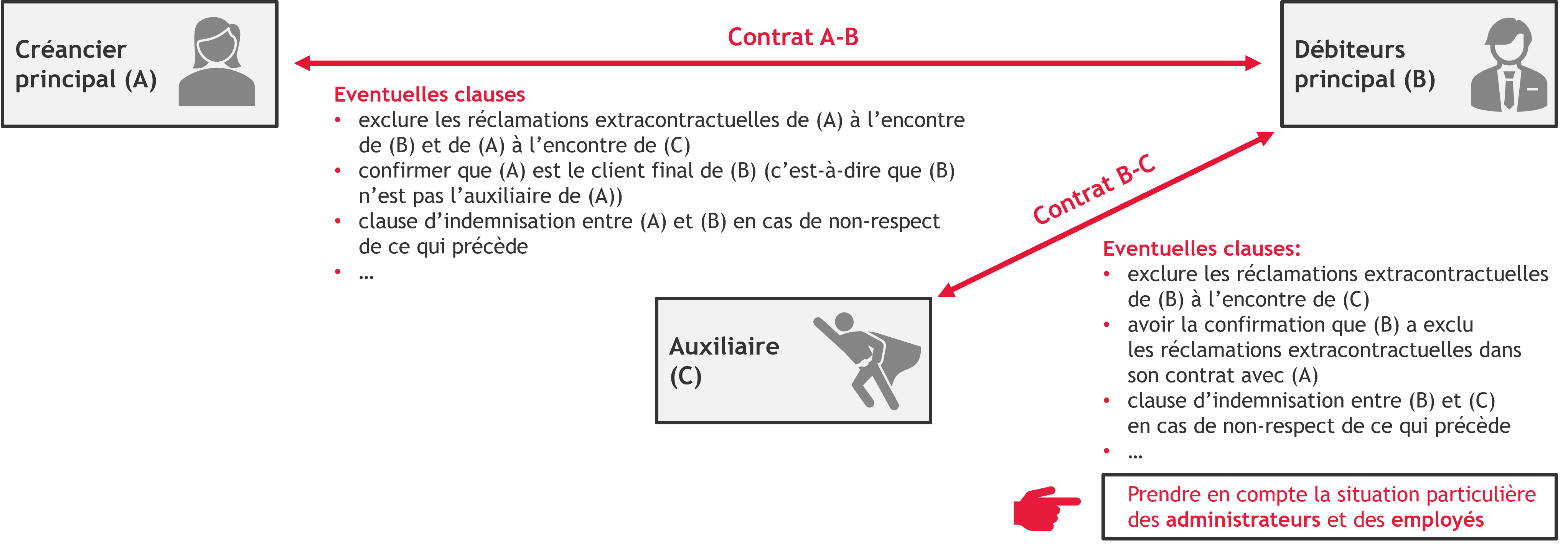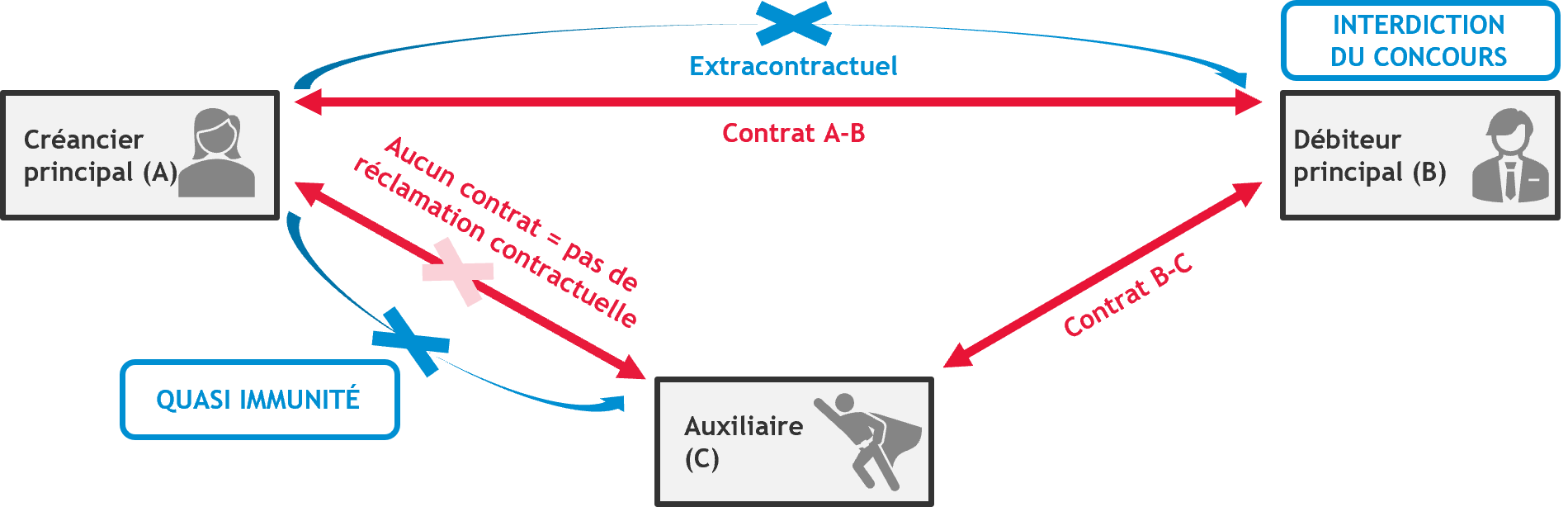 - Aujourd’hui : , en principe, les parties contractantes ne peuvent se poursuivre mutuellement sur la base des dispositions contractuelles que si l’une d’entre elles exécute mal le contrat. Les contractants ne peuvent presque jamais se poursuivre mutuellement pour des « motifs extracontractuels » (l’« interdiction du concours »).