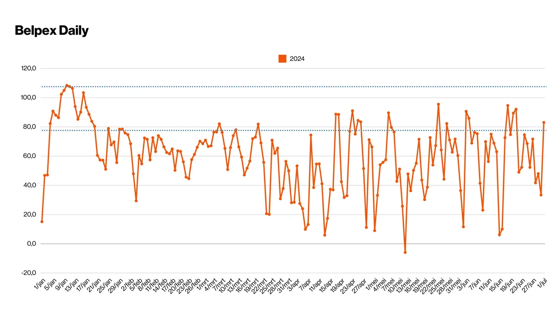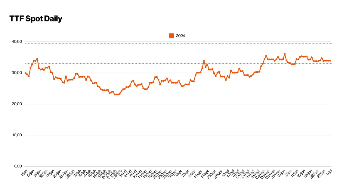 Au premier trimestre 2024, on observe une nette tendance à la baisse des prix du gaz, avec une diminution d'environ 17 % après janvier. Le prix journalier moyen le plus élevé est passé de 34,47 € en janvier à 28,61 € en mars. D'avril à juin, nous observons à nouveau une tendance à la hausse par rapport au premier trimestre, le prix le plus élevé atteignant 34,26 € au début du mois de juin.
