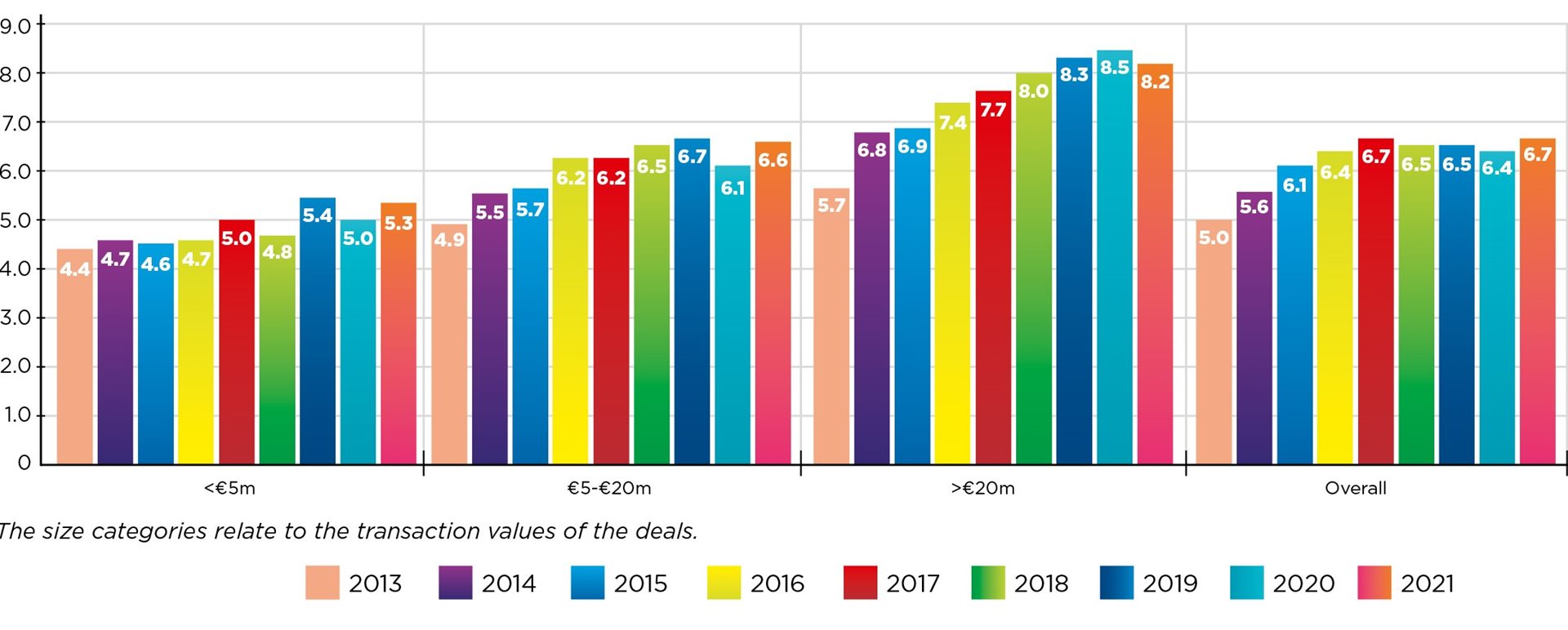 Mathieu Luypaert: “Onze studieresultaten bevestigen dat we al jaren op een plateau zitten. Vandaag bedraagt de gemiddelde ondernemingswaarde/ebitda-multiple 6,7 (in mensentaal: 6,7 keer de operationele cashflow) of iets meer dan de 6,4 van 2020. Hij varieert van 4,5 voor targets met een waarde van minder dan 1 miljoen EUR tot gemiddeld 9,9 voor deals van meer dan 100 miljoen EUR. De multiple van 6,7 ligt trouwens significant hoger dan de multiple van 5 in 2013, toen we startten met ons onderzoek.”